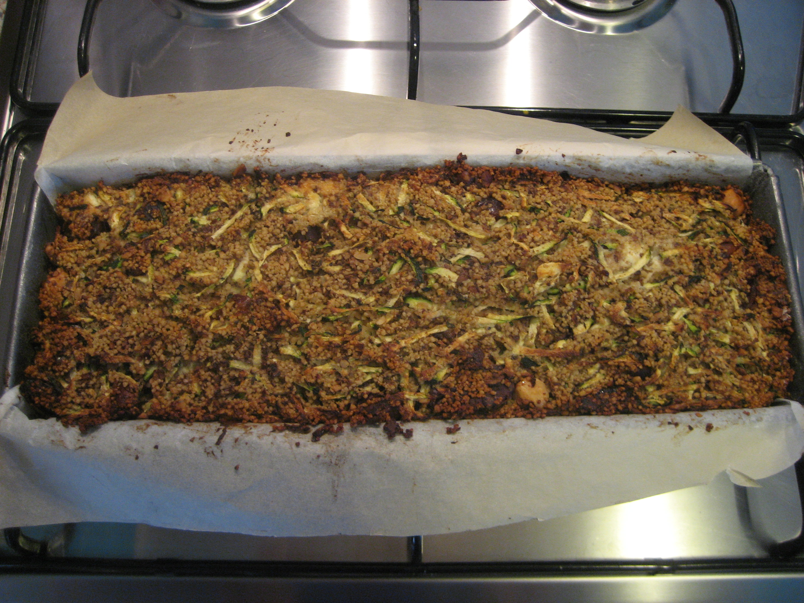– Pureer het mengsel met de helft van de noten in de keukenmachine. Doe in een kom en voeg de rest van de noten, courgette, couscous, eieren en dadels toe. Verkruimel de geitenkaas erboven. Schep om, doe in de vorm en bak zo’n 50 minuten in de oven.