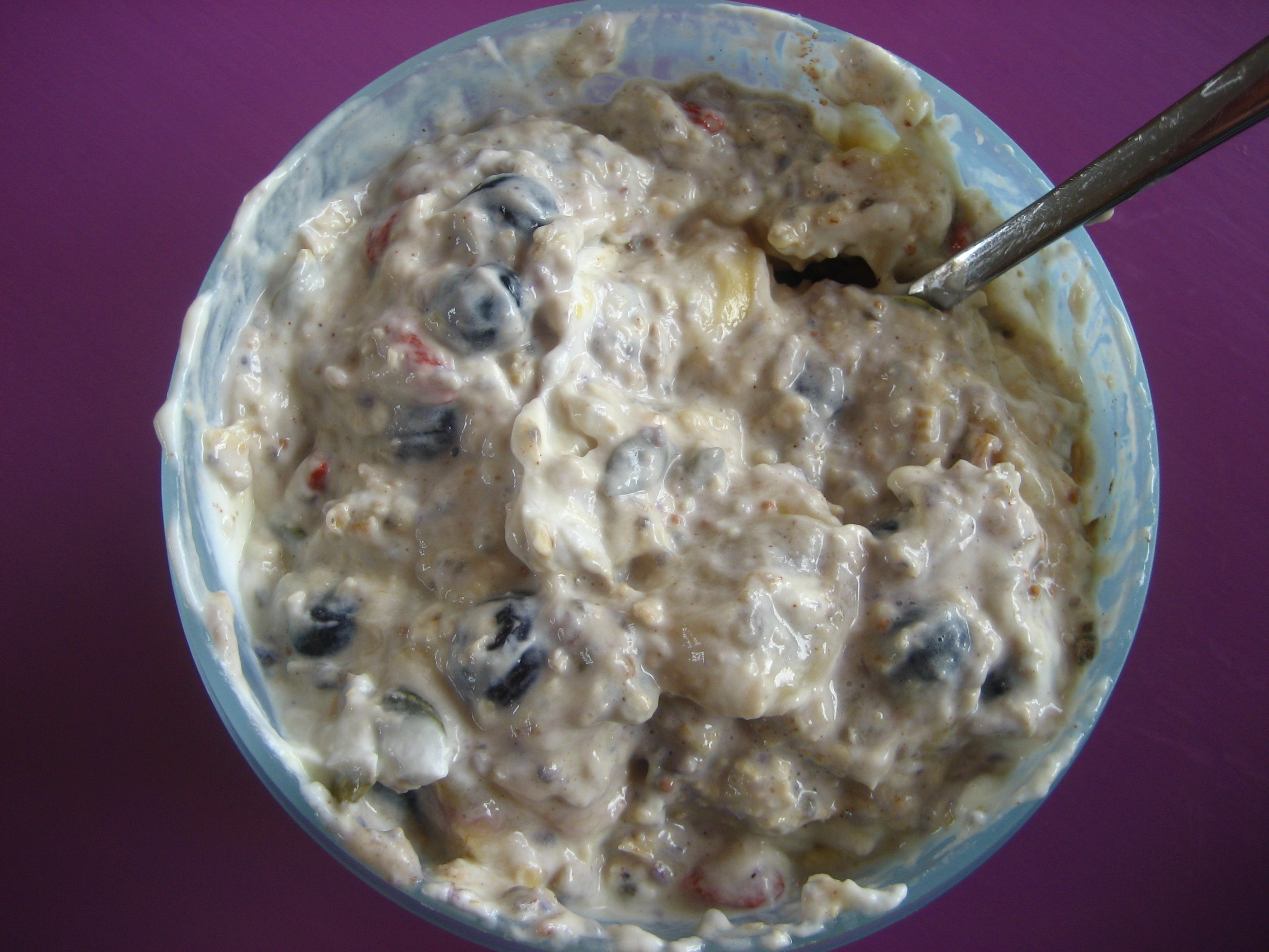 IMG_3385[1]Sinds kort heb ik een nieuwe ‘ontbijtverslaving’. Een recept waarmee de start van je dag een feestje wordt, hoewel niet iedereen het daarover met mij eens is. De meest voorkomende reactie die ik krijg als ik over mijn nieuw ontdekte powerontbijtje vertel is de zogenaamde ‘opgetrokken neus’.  Deze neus wordt aan de ene kant bijgestaan door een gruwelende grimas en de uitspraak: ‘Brrr…ik heb een hekel aan pap’. En aan de andere kant ontstaat boven de neus een verbaasde blik met: ‘Maar havermout, dat moet je toch koken?!’