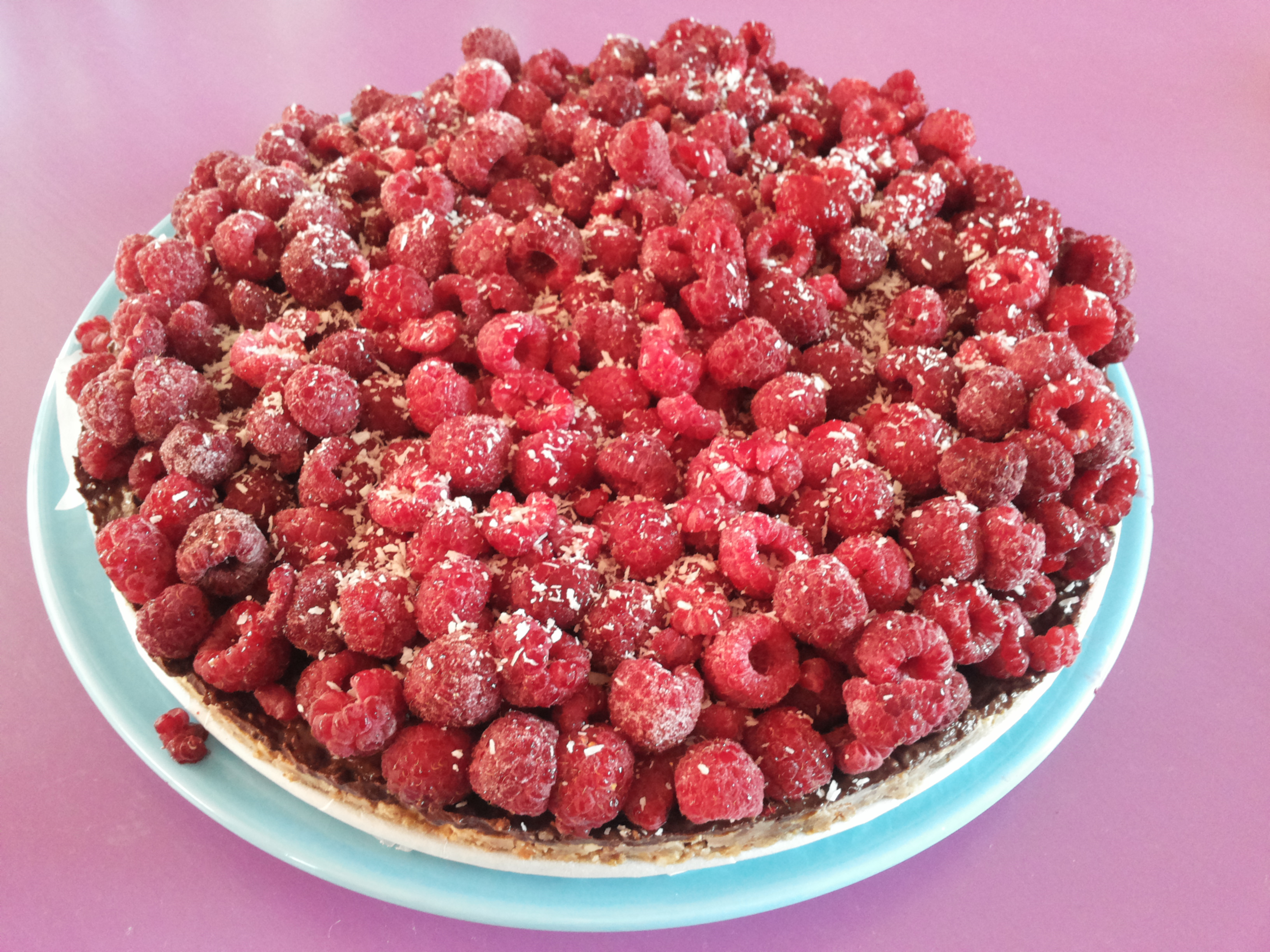 – Wanneer de taart goed stevig is geworden verdeel je er de (ontdooide) framboosjes overheen. Maak het voor de sier eventueel nog af met een klein handje kokosrasp.