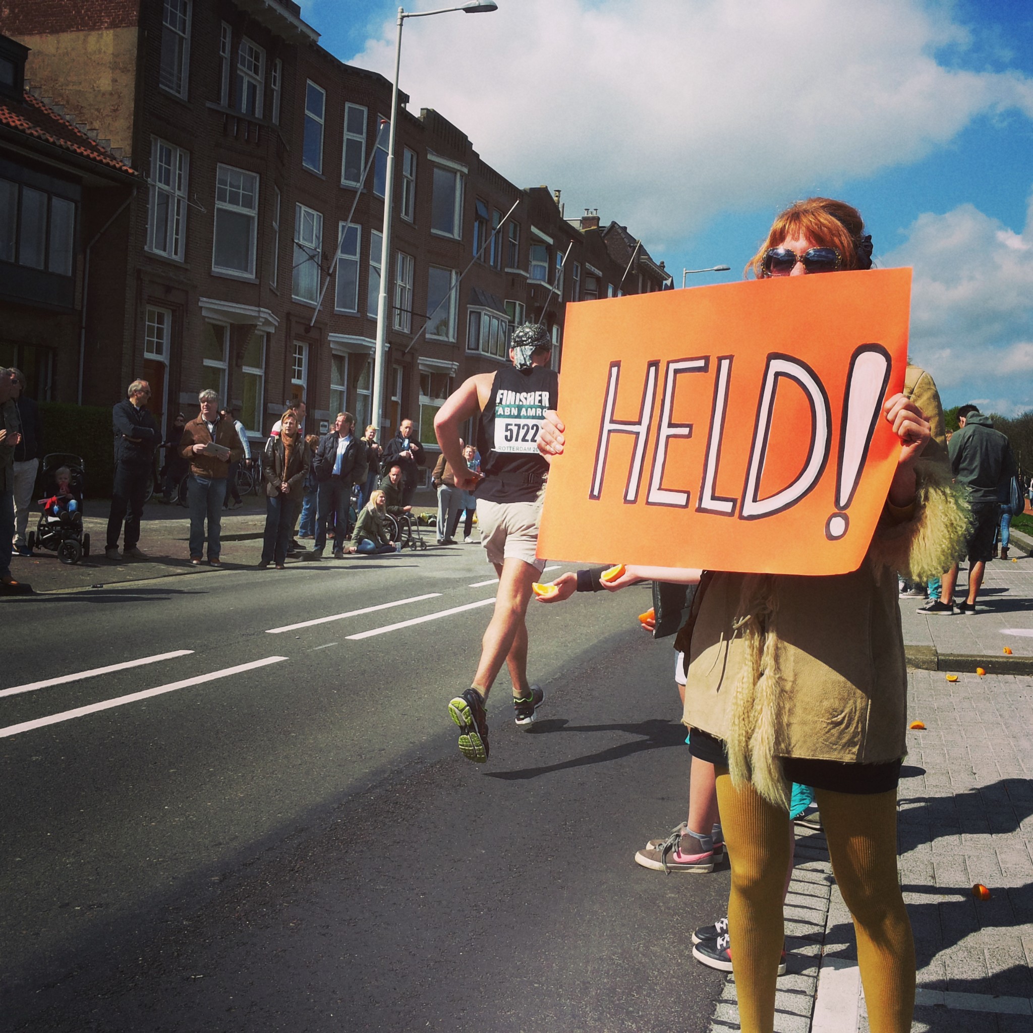 Gek of niet. Lekker opgewarmd waren we wel. En met een kleine break was het dan ook tijd voor het echte werk. De marathonlopers. Ook een volkje waar je voor uit moet kijken overigens. Ze mogen dan misschien niet schreeuwen, gek zijn ze wel. Dat besef je wel als je op kilometerpunt 37 bloedende tepels, zoutpilaar koppies en verkrampte kuiten langs ziet komen. Regelrecht gekkenwerk! Maar ook absolute heldenarbeid. Want hoe koelbloedig moet je zijn om zo’n afstand te volbrengen? Het kon mij dus niet meer schelen wat al die andere toeschouwers van dit wilde geschreeuw dachten; deze gekke helden konden best wat gekke heldensupport gebruiken.