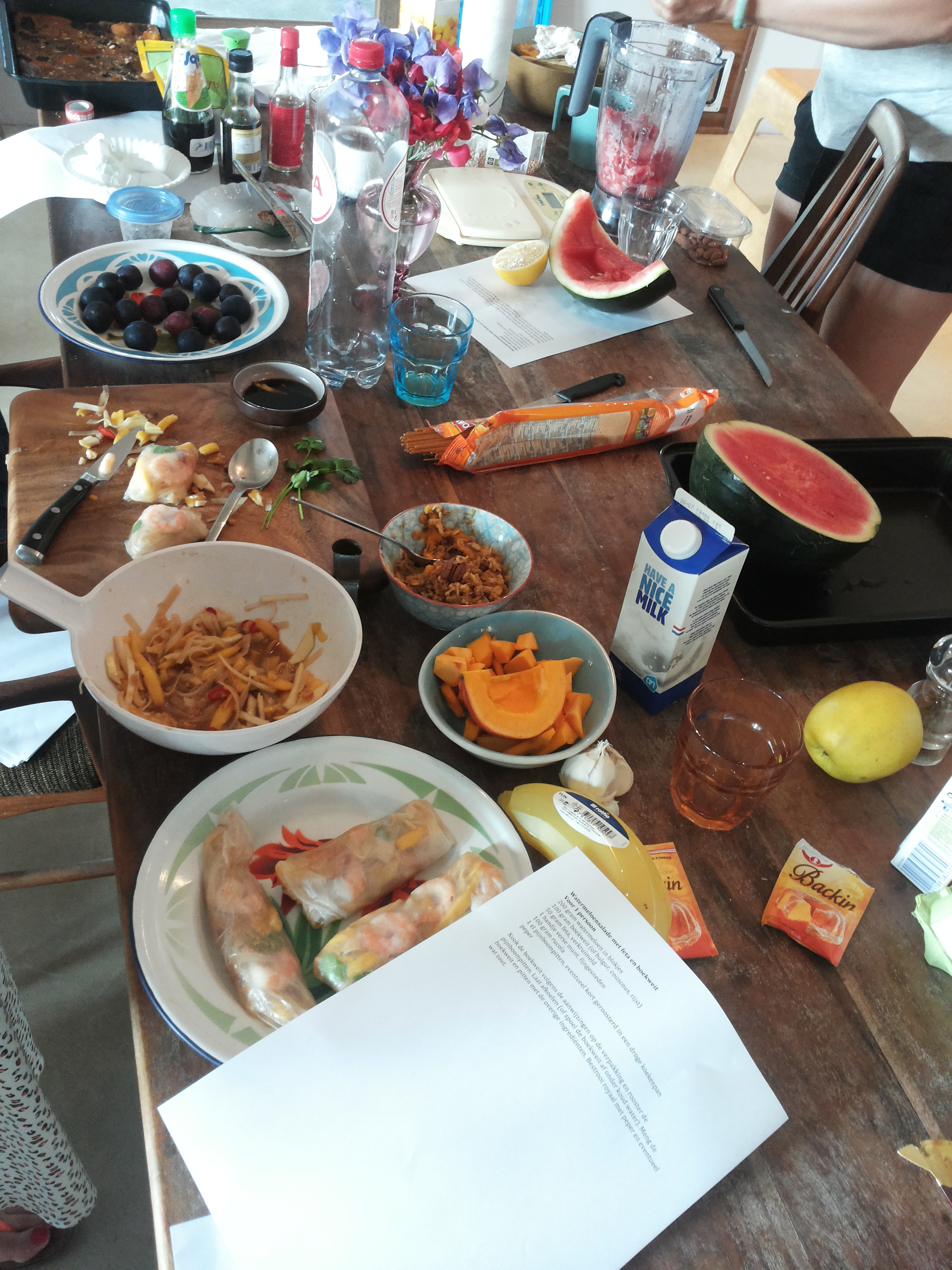 20140719_160934En zo stond ik zaterdagmiddag op het station van Barneveld. Klaar om opgepikt te worden door Miriam om mee te rijden naar de locatie waar die dag een heuse kooksessie gehouden zou worden met een groep sportievelingen en twee boodschappenkratten vol gloedjenieuwe recepten. Tien gerechten: klaar om bereid, gefotografeerd en – natuurlijk! – geproefd te worden.