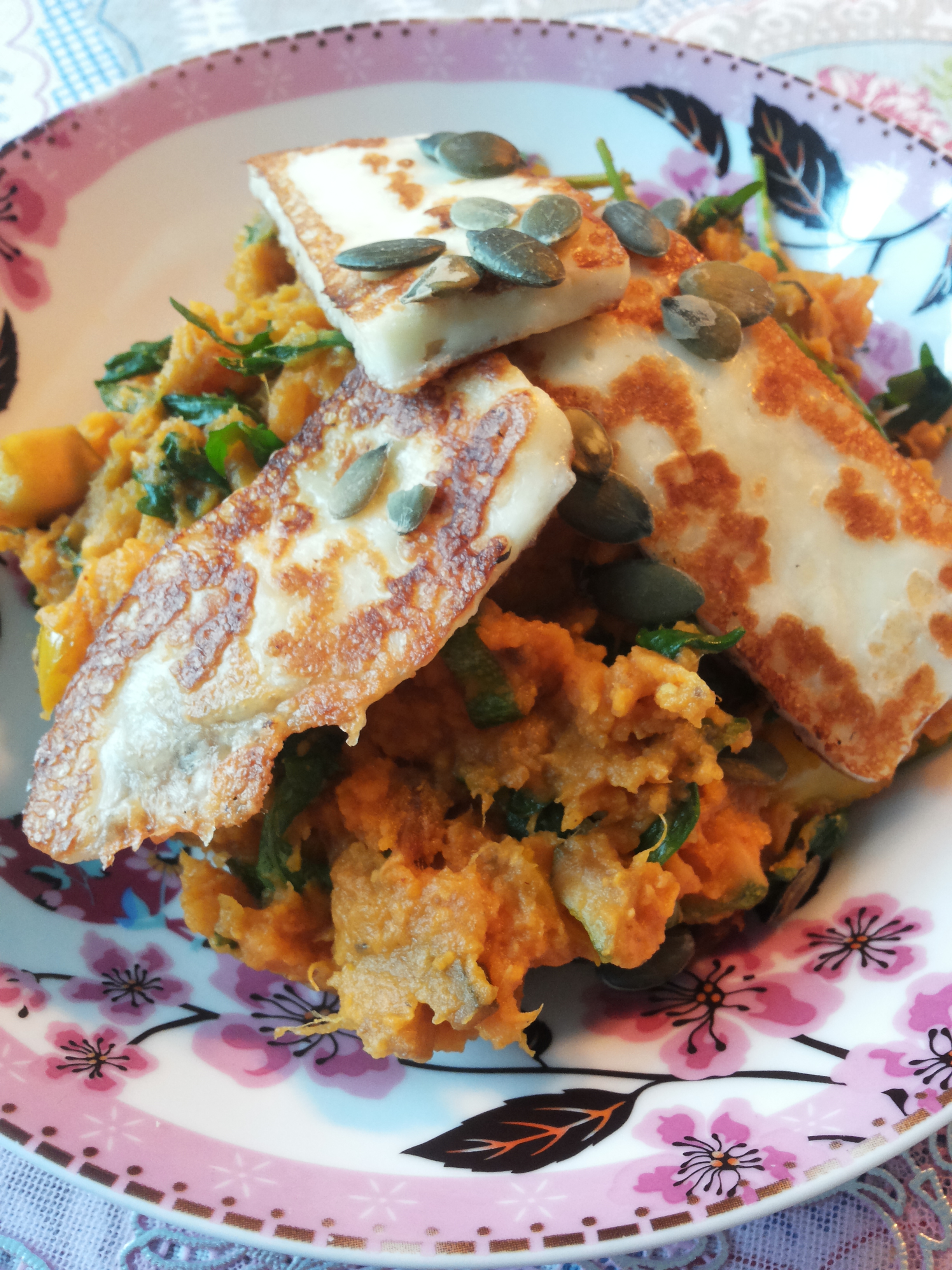 – Als de halloumi klaar is: schep op ieder bord een flinke schep stamppot, verdeel de plakjes halloumi eroverheen en maak af met wat pompoenpitten.