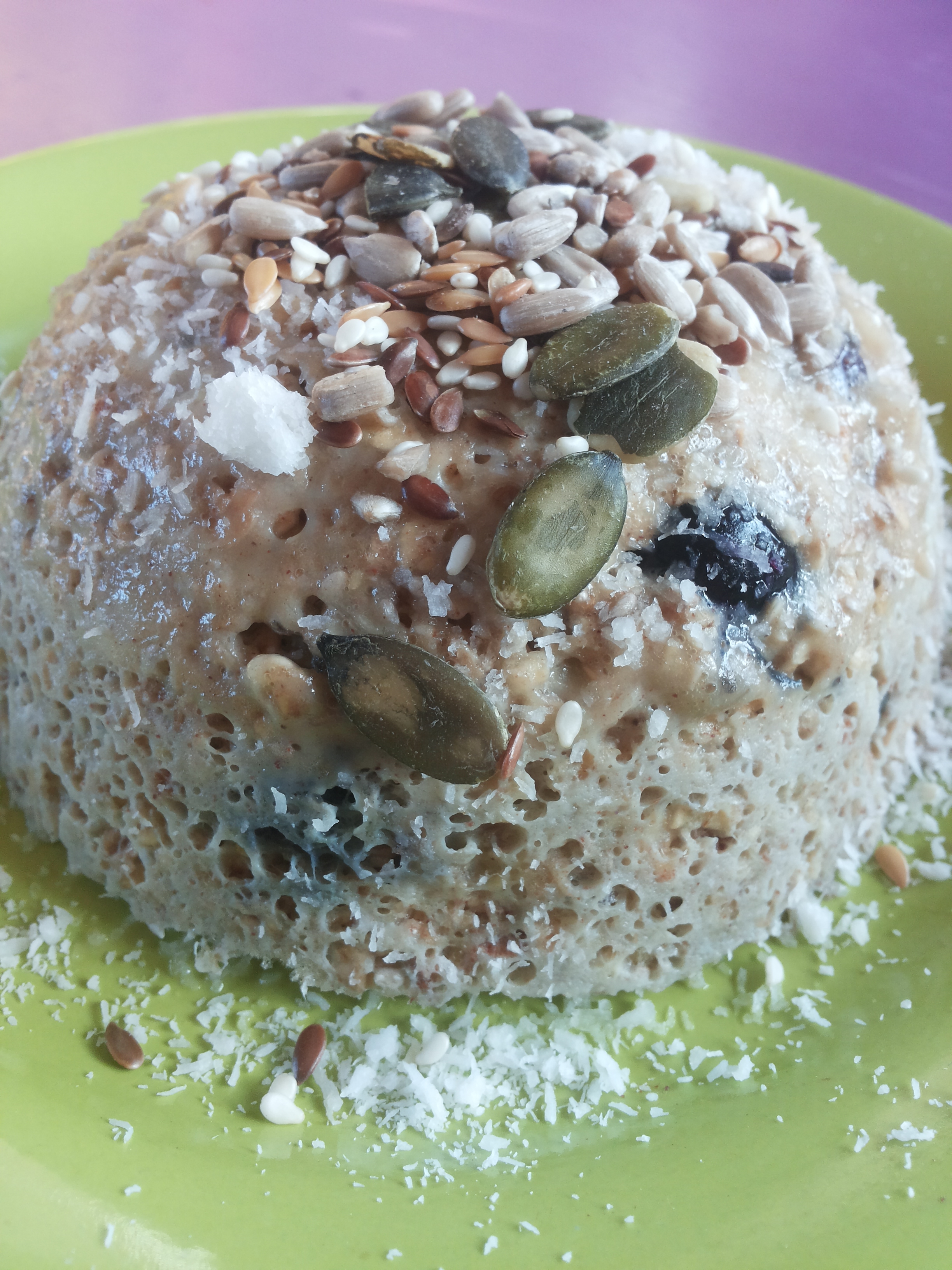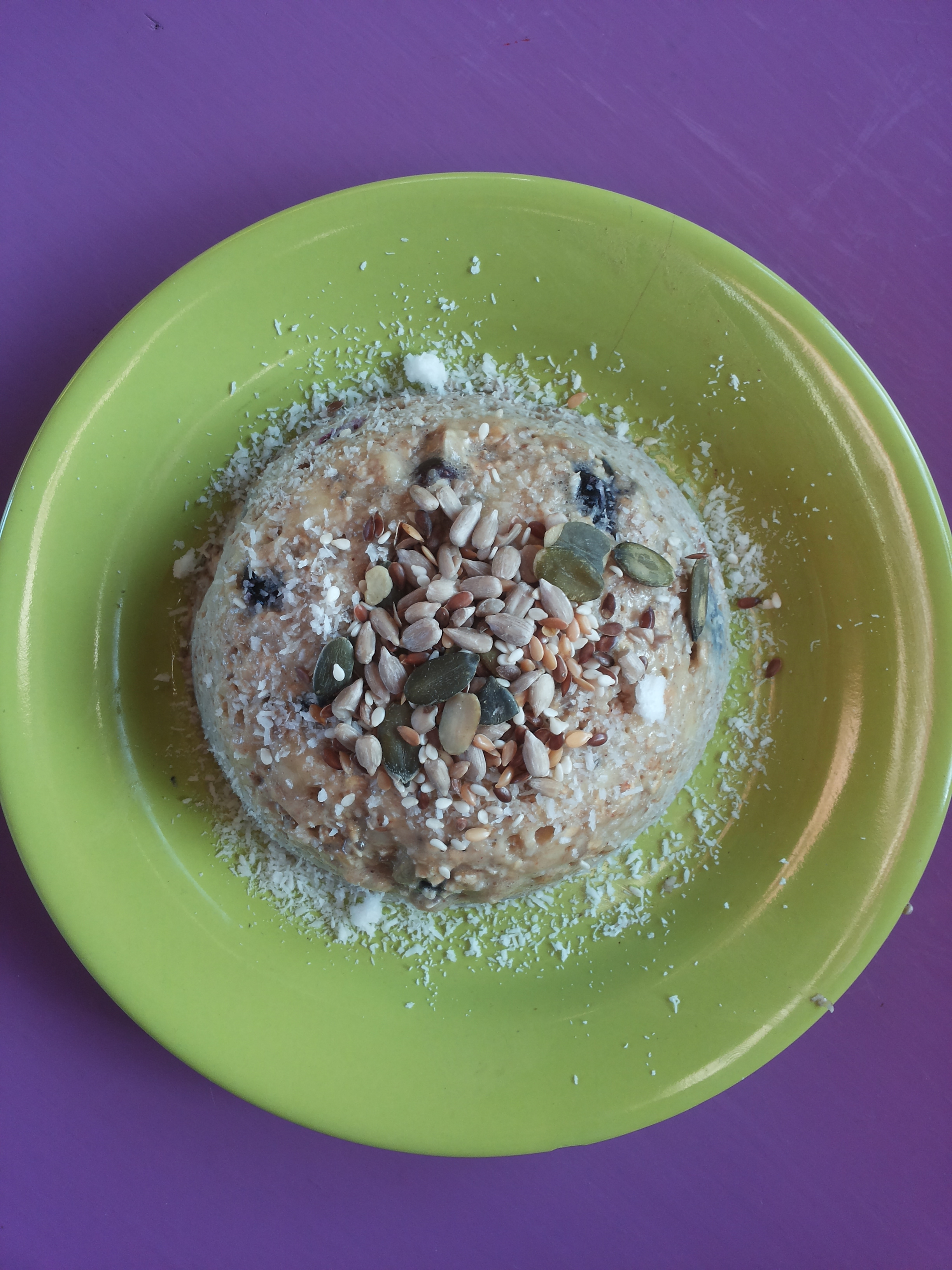 Natuurlijk kun je deze snelle havermoutpap zo uit het kommetje lepelen. Leuker is echter om de boel om te keren op een bord zodat je echt een taartje krijgt! Ik maakte hem vanochtend af met wat kokos, zaden en pitten. Dat had ik na 14 kilometer lang feestvieren namelijk wel verdiend!