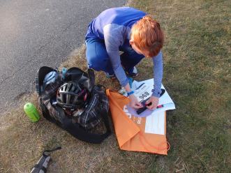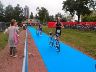 Snel richting de transitiontent dus en op zoek naar mijn tas met fietskleren. Dat is nog niet zo simpel in een wirwar van natte triatleten die allemaal zo snel mogelijk door willen naar het volgende onderdeel. Een hele handige constructie was het dan ook niet, vooral als je even vergeet dat die tas met fietskleren na het omkleden natuurlijk wel met wetsuit en al weer afgeleverd moet worden wil je je spullen na de finish weer op kunnen halen.