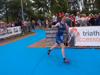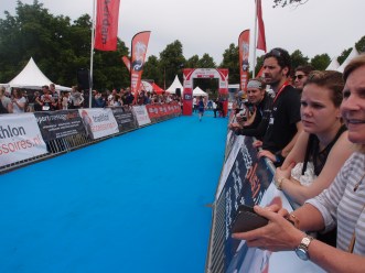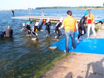 Ondertussen werd het steeds drukker bij het startterrein en spotte ik ook mijn mede-clubgenoten René, Mark en Hanno, vergezeld door supersupporter Alida. Toch altijd leuk bekende gezichten te zien en eventuele startstress samen te delen. Want ja, die begon nu toch langzaam wel te komen. Kriebels in de buik en de grote vraag: Kan ik dit? Gaat het me echt lukken? Gelukkig wist een mevrouw van de organisatie me een beetje moed in te spreken ‘Och meissie, je eerste OD? Juist dan geen nood! Je hoeft alleen maar te finishen!’ En warempel! Daar had ze gelijk in! Kom op Sanne, klaar met zenuwen…gewoon gaan. Stukkie zwemmen, stukkie fietsen, stukkie lopen. That’s all! Tijd is niet belangrijk. Finishen wel. En genieten!