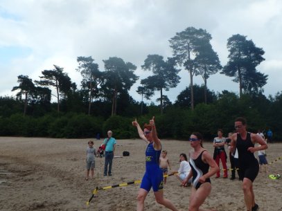 Oef! Dat valt nog niet mee! Zwemmen gaat normaal gesproken prima. Maar dan heb ik meestal niet eerst 2,5 kilometer volle bak gelopen. Terwijl mijn benen als zware bakstenen voelen, proberen mijn longen naarstig zuurstof op te nemen. Wat nog niet meevalt als je het merendeel van de tijd met je hoofd en mond in het water ligt. Gelukkig lijkt mijn lijf zich na 150 meter weer aardig te herpakken, doen mijn benen weer gezellig mee en heb ik mijn ademhaling onder controle. Ik heb de slag te pakken en wordt al zwemmend eigenlijk door niemand ingehaald. Af en toe moet ik even navigeren naar de boei, maar eigenlijk zitten de 500 meter er op voor ik het weet. Snel het water uit dus, even lachen naar de camera van Jantiene en op naar de laatste wissel.